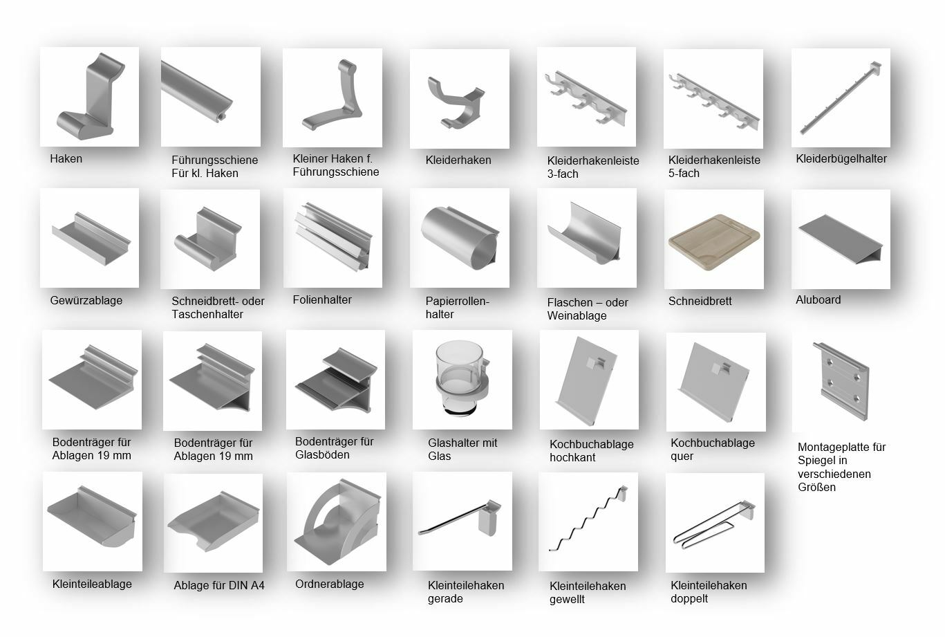 Für unsere Funktionspaneele steht ein umfangreiches Sortiment an Zubehörteilen zur Verfügung. Diese werden direkt in die Funktionsschienen eingehängt und können jederzeit verschoben und in eine andere Schiene versetzt werden.
